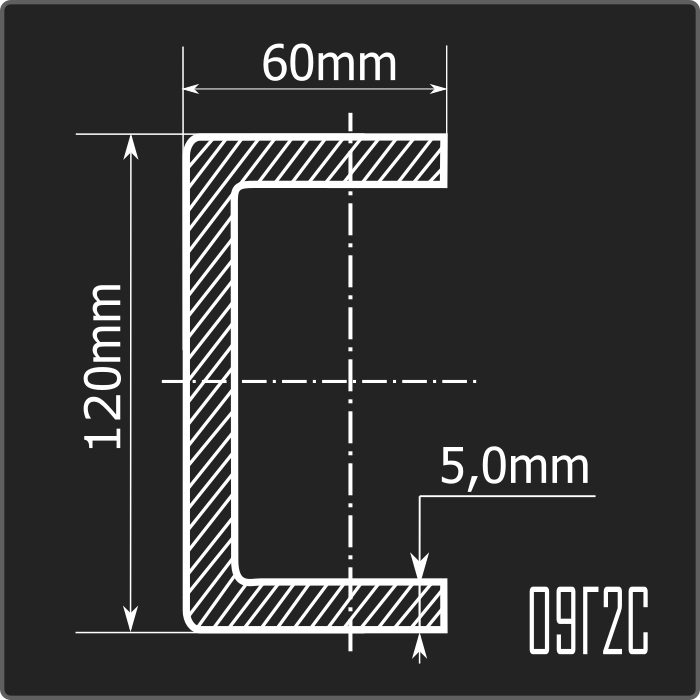 Швеллер стальной холоднокатаный гнутый равнополочный 120*60мм, толщиной 5,0мм и длиной 12м. Материал - низколегированная сталь. Соответствует требованиям ГОСТ 19281-2014.