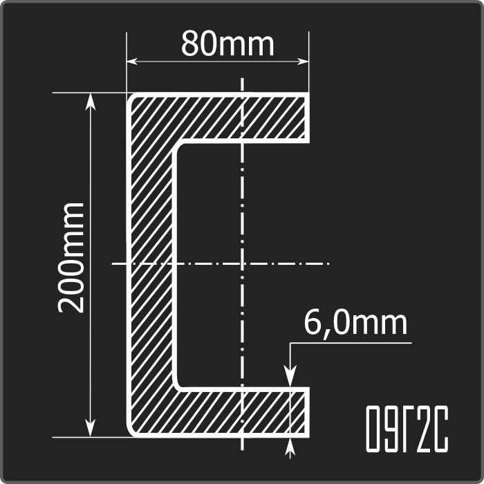 Швеллер стальной холоднокатаный гнутый равнополочный 200*80мм, толщиной 6,0мм и длиной 12м. Материал - низколегированная сталь. Соответствует требованиям ГОСТ 19281-2014.