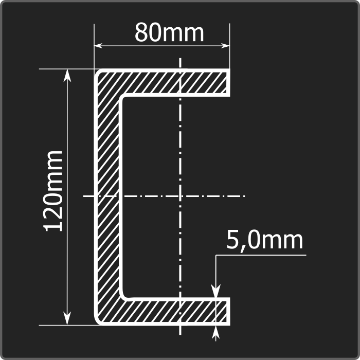 Швеллер стальной холоднокатаный гнутый равнополочный 120*80мм, толщиной 5,0мм и длиной 12м. Материал - углеродистая сталь. Соответствует требованиям ГОСТ 8278-83.