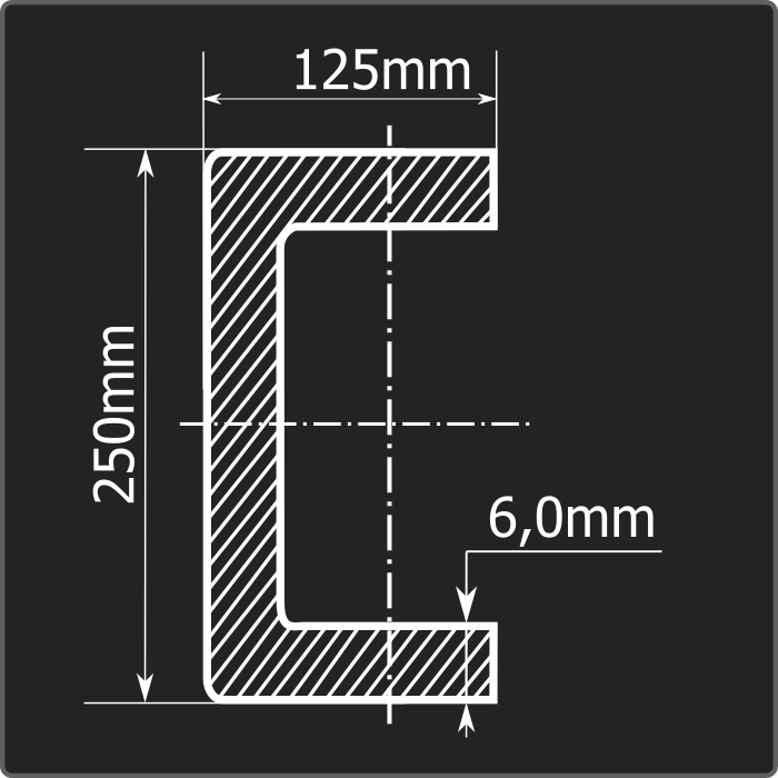 Швеллер стальной холоднокатаный гнутый равнополочный 250*125мм, толщиной 6,0мм и длиной 12м. Материал - углеродистая сталь. Соответствует требованиям ГОСТ 8278-83.
