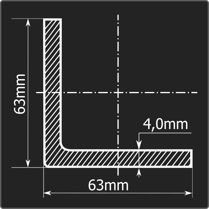 Угол стальной холоднокатаный гнутый равнополочный 63*63мм, толщиной 4,0мм и длиной 12м. Материал - углеродистая сталь. Соответствует требованиям ГОСТ 19771-93.