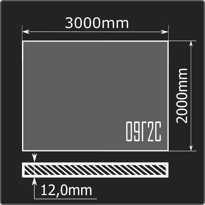 Лист стальной горячекатаный толщиной 12мм, шириной 2000мм и длиной 3000мм. Материал - низколегированная сталь. Соответствует требованиям ГОСТ 19281-2014.