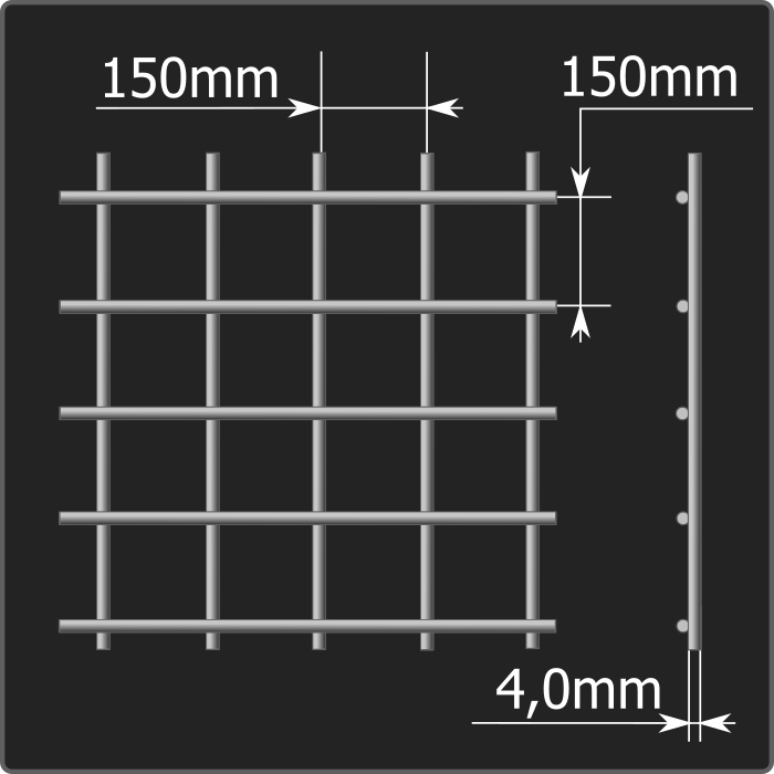 Сетка сварная с размером стороны ячейки 150*150мм из термический необработанной проволоки диаметром 4,0мм шириной карты 2,0м и длиной 3,0м. Соответствует требованиям ТУ 25.93.13-001-03876796-2019.