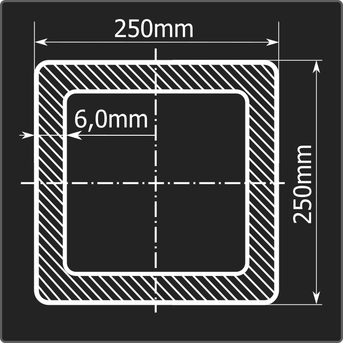 Труба профильная стальная квадратного сечения 250*250мм, длиной 12м и толщиной 6,0мм. Материал - углеродистая сталь. Соответствует требованиям ГОСТ 30245-2003. Стандартный пакет: вес - 2,172тн., количество - 4шт.