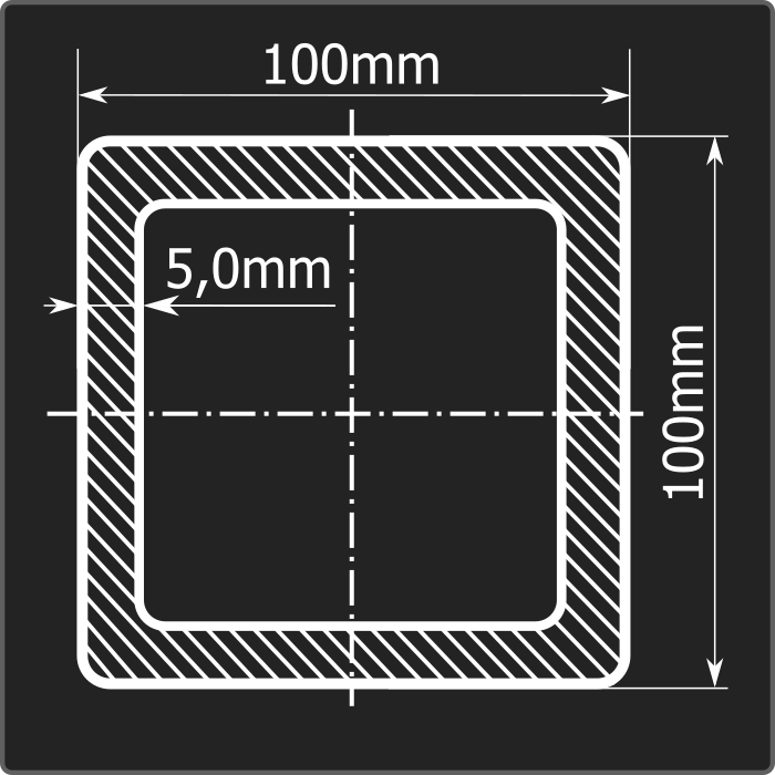 Труба профильная стальная квадратного сечения 100*100мм, длиной 12м и толщиной 5,0мм. Материал - углеродистая сталь. Соответствует требованиям ГОСТ 13663-86. Стандартный пакет: вес - 6,229тн., количество - 36шт.