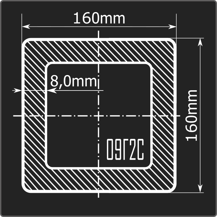 Труба профильная стальная квадратного сечения 160*160мм, длиной 12м и толщиной 8,0мм. Материал - низколегированная сталь. Соответствует требованиям ГОСТ 30245-2003. Стандартный пакет: вес - 5,251тн., количество - 12шт.